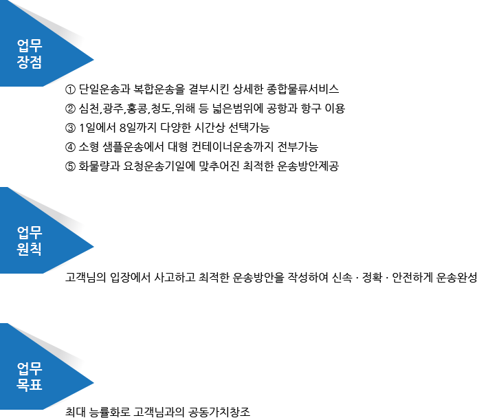 의거한 최적화된 물류방안으로 고객님의 각종 물류수요를 만족시켜 드릴수 있습니다.